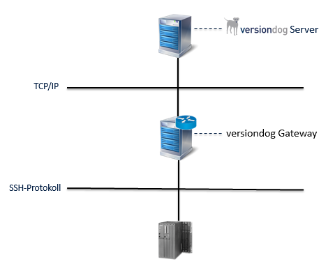 SSH 网关可实现 versiondog 服务器与 SSH 服务器之间的通信。SSH 服务器无法通过服务器的 TCP/IP 网络直接访问。例如,可以通过 SSH 网关与Siemens SINUMERIK 840D sl 的 NCU 建立通信。