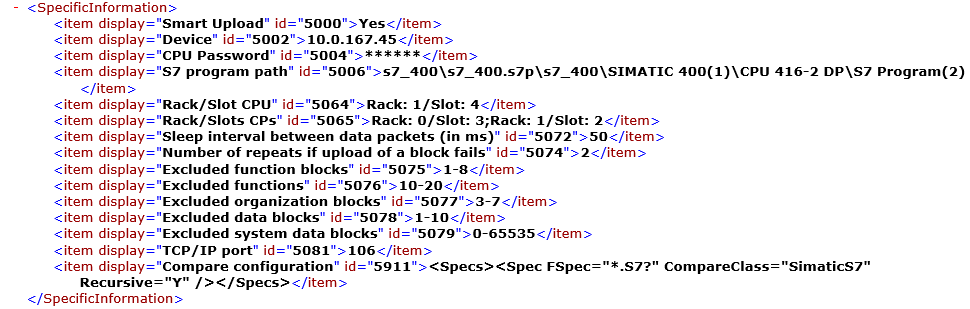 除了用户名和作业配置的时间戳外,元素 <GeneralInformation> 还包括 通用 和 上传和比较 中不符合标准且已被用户更改的配置。